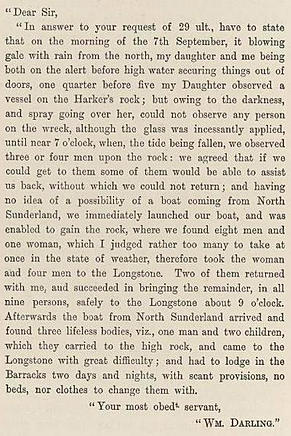 Grace, unable to sleep, was watching the storm through her bedroom window. She saw a large, black shape on Big Harcar Rock. Grace woke her father and with a telescope they studied the wreck for signs of life. They were none. Grace watched and watched and as daylight crept in around 7am Grace saw movement on the rock. There were indeed survivors of the wreck, two or three perhaps. William thought the sea was to rough for the lifeboat from Seahouses to set out, so he pondered what to do.